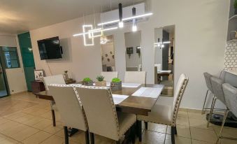 The apartment features two modern bathrooms and a fully renovated kitchen, complete with all the amenities you need to cook up a delicious meal. Enjoy your meals at the dining table for six or at the four stools at the kitchen bar. Free Wi-Fi, flat smart TVs, and air conditioning units ensure your stay is comfortable and convenient.