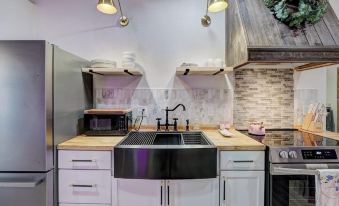 HOT TUB!! Come and relax in the stunning hot tub!! Fire pit, steps off the porch to the lake bath!!! Walk to all the cool shops, restaurants, and live music.