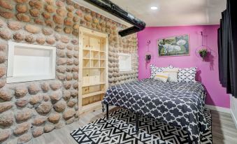 Nice cobblestone cabin with modern amenities including a W/D and an outdoor fire pit and hot tub Cameras on all sides of the building and good outdoor lighting for safety Enjoyed sitting on the porch swing on the screened in front porch Short walk to area shops & restaurants