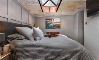 Quirky copper exterior, reclaimed wood ceilings and forget-me-not blue features. The Hideaway is a luxury retreat, tucked away in the tranquil village of Twyford and surrounded by Leicestershire’s idyllic countryside. With both traditional and contemporary stylings, this hideaway combines exposed features with luxury finishes, an abundance of industrial charm and a bedroom purpose-built for stargazing, making this a year-round favourite.