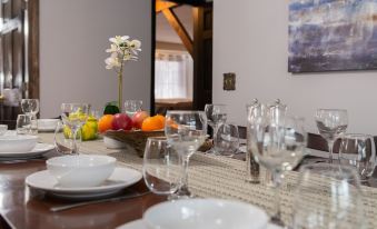 The kitchen comes equipped with everything you need—cookware, oven-safe dishes, a vegetable steamer, wine glasses, beer mugs, utensils, and more.