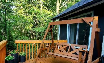 Enjoy treehouse vibes on the elevated back deck, complete with string lights, a porch swing, and umbrella-shaded seating. Out front, a hammock strung between two towering oaks awaits your favorite book.