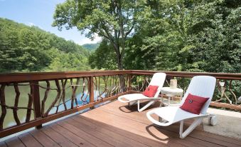 $2100.00 per week - True mountain lakeside escape. This rustic home has three bedrooms (2 queen bedrooms and one twin bedroom, sleeps six). With only one bath you'll be delighted with the outdoor shower that has hot and cold running water. Situated on 17 pristine acres with high elevation in its own little cove. The private lake is 2 - 3 acres in size. The active bunch can fish, swim, canoe and paddle on the lake while the rest can watch from the open and covered decks and cheer them on! There is a fire pit lakeside for cool evenings and a good old fashioned marshmellow roasts. Some of the toys onsite are; paddle boat, canoe and a dock. All this at your doorstep.