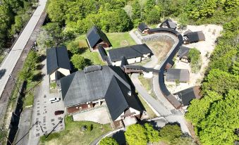 A stand-alone hot spring inn nestled in a lush mountainous region.