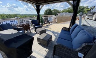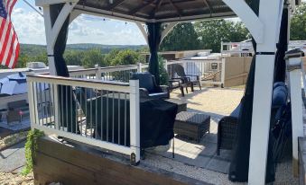 Robins Nest is a one bedroom camper setup permanently on a private lot. It has a beautiful deck that is great to enjoy the evenings as well as a large elevated patio with gazebo that affords beautiful sunset views and is a great place to cook out on the flat grill and enjoy company.