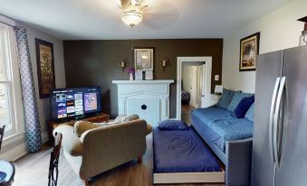 Completely separate apartment with no shared spaces! Victorian home built in 1860 has old-world charm but modern amenities. Home has been converted to a modern triplex w/ brand new flooring, cabinets, fixtures & appliances. This apartment was created for VRBO. 2 Queen-size brand new Tuff-n-Needle beds along with high quality pillows. Living room has trundle couch with 2 twin beds. Over 60 amenities included in this small apartment to give as much comfort as possible. Outside the home was also recently painted, new roof, new asphalt parking and new steps.