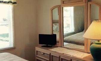 The kitchen is fully equipped with all of the items needed to prepare and serve meals. There is a gas grill and outdoor shower. All of the bedrooms and the living room have flat screen TVs and Direct TV. The cottage also has wireless internet (the passcode is posted on the refrigerator). The cottage is equipped with a phone with unlimited long-distance access.