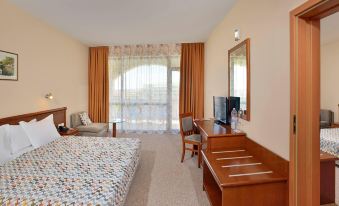 Overall, the hotel is very solid – clean, green, nice pool, and direct access to the sea. Food is varied, and the fish dishes – smoked, fried, and pickled – are top notch. Staff is friendly and helpful, except for one lady at reception, who, when we pointed out that our "Sea View Room" had mostly Tree View with occasional flashes of blue, replied: "Hotel is full, nothing can be done." Classic: You paid? Great. Now enjoy your leaves. Sea view rooms are basically only from floors 3 or 4 upwards. We were lower, so "sea view" required yoga-level flexibility and mild Jedi telekinesis to part the trees. Definitely not worth the extra charge. The extra room with a bunk bed is strictly for kids. The gap between the bed and the wall is about 40–50 cm, so unless you’re a teenager shaped like a straw, don’t even try. Interior decor? Let’s call it "love for MDF with a touch of vintage Bulgarian charm." But it’s clean, the AC works, and nothing’s falling apart – so it’s livable. The room is big and spacious, though you're not quite sure what for. All Inclusive drinks are fine – unless you try the rum. That thing tastes like a blend of paint thinner and wood stain. Honestly, like someone tried to make a mojito using leftovers from a home renovation. And of course – the sunbed race. Technically, reserving is not allowed. In practice? People are staking claims at 5:30 AM. Show up at 7:00 and you’ll be sitting on a wall, bitterly watching towels live their best lives. Summary: A hotel worth recommending – but get a room on a high floor, avoid the rum, set your alarm for 5:29, and don’t fall for the “sea view” promise, unless you enjoy playing Where’s Waldo: Ocean Edition.