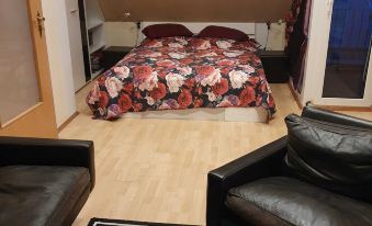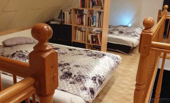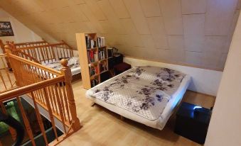 Our holiday property is located in the middle of the green in the back of our property. In addition to the separate house entrance, you have your own parking space on the enclosed property under the carport. The property has a very spacious living area with a large sofa area, TV, fireplace and dining area. The hallway area has a spacious built-in closet in which there is plenty of storage space. You will also receive cozy slippers for young and old right after the entrance. Furthermore, in the lower area there is the fully equipped kitchen, the two bath rooms with sauna, tub, shower. The bedrooms are located in the upper area. A separate master bedroom with sitting area, TV, VCR and small balcony. Next to it is the open children's or youth area with 2 140 cm beds, which can be placed as a single, double bed or sofa if required. There is also a small play area with a selection of toys. Due to the open design, occupancy with small children is possible at their own discretion, but no installation of stair guards or other baby safety devices on the stairs. Furthermore, we would like to point out that you have a dog, meaning that the ID "suitable for allergy sufferers" does not apply to our property, despite all cleaning care and efforts! Every animal owner can certainly feel this, even if the animal never enters the room, it cannot be imposed by their own clothing etc.