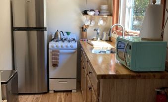 As you step inside, you'll be greeted by a fully stocked kitchen, complete with a stove, oven, refrigerator, grill, microwave, coffee maker, and all the essentials you need to whip up delicious meals. Enjoy your culinary creations at the dining table, surrounded by the warmth of the cottage.