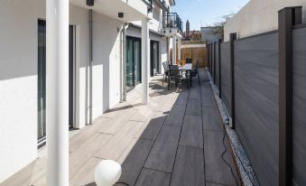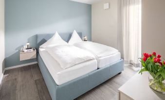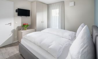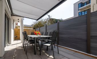 Downtown - new building - 100% green electricity! In the Villa Rosch we rent our large 125sqm - ground floor apartment with 45sqm terrace from 01.07.2017. 4 bedrooms incl. LED TV (3x large double beds, 2x single beds (also for adults) offer our guests plenty of space. There are 2 bathrooms in the apartment. Two large sliding doors invite you from the living area to go to the spacious terrace and linger there for a long time. The apartment with high equipment offers everything 8 need.