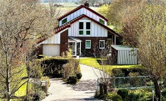 The house has very good basic equipment. The open kitchen is equipped with everything you need for a pleasant and relaxing stay. The spacious living and dining room gives enough possibilities. You can sit together comfortably at the large dining table. Alternatively, you can enjoy the crackling fireplace on the cozy couch. The lower living area is tiled and equipped with underfloor heating.