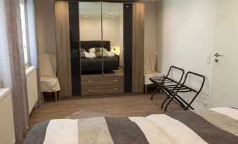 The beautiful apartment is located on the ground floor of our two-family house and has a living room with a cozy living area and flat-screen TV (satellite TV), a bedroom with a double bed, a bathroom with bathtub, shower, toilet, large vanity, an open, fully equipped kitchen with dining table, Microwave, oven, refrigerator, coffee maker, toaster, a cloakroom and a technical room with washing machine and dryer.