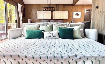 This chalet has 3 bedrooms and sleeps a total of 10 guests. 1 King bedroom, 1 Queen bedroom, 2 twin/full bunk bedroom (sleeps 4), and a pullout couch in the main living space. Kitchen, dining and living area are open and spacious. 1 3/4 Baths. The lower level also has an additional living space with another couch, Pac-Man machine, and tv for entertainment. Great house for families and friends!