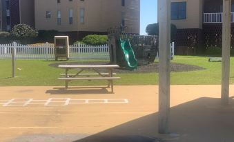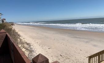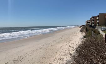 Beautiful OCEANFRONT condo with ocean and pool views! This condo is on the first floor with an open concept! Fully stocked kitchen, oceanfront master bedroom, queen bed, with private bath and sliding doors to the ocean front balcony. The second bedroom has two twin bunk beds. Stack washer and dryer in hallway. Queen size pull out sofa in living area. The condo community offers a large pool, walkway to the beach with showers and elevators. Playground pavilion and grilling area with basketball, cornhole and other games. Come see what relaxation really means! Sleeps 6!