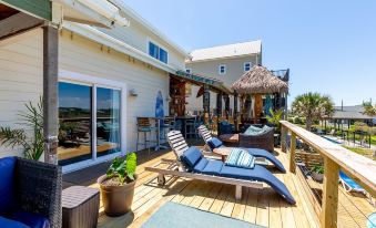 Everyone in your family will have the best vacation staying at this property! Not only is it located in a unique location and a great layout. It also has so many on site complimentary amenities for everyone to enjoy. Think of the fun the kids will have with the convenience of on site activities. The following are included. kayaks, paddle boards, surfboards, beach chairs, coolers, beach cruiser bikes, beach carts. Gas grill with propane provided. Outdoor movie projector area. Assorted paddles and life jackets. Linens and cleaning included. Plus more below. This truly unique property offers the best of both worlds. The back yard is located on the canal and overlooks the inter-coastal. While the front of property faces the ocean. There is nothing in front of home except the street and the sand dune. The public beach access is always open and is close, just across the street and 2 houses down. The property has its own private boat ramp and private boat docks. Bring your own boat, swim in the canal or fish, crab or shrimp right off one of the three docks. The back deck is massive. It is the best feature of the property and includes a unique 8 seat TIKI BAR that has its own Smart TV, Blue tooth speakers, fridge, beach decor and lighting. Your family can watch a sporting event or simply listen to music on the Blue tooth speakers. There is plenty of room for everyone to spread out. There are an additional two separate lounge areas, a dining area and a chaise lounge area. From the back deck you and your family can watch sunsets, boaters, the kids fish off the docks and the swimmers in your private swimming pool. The gated pool is 28’ x 14’ with 4 loungers and Adirondack chairs. There is a cabana area where you can get shade while still being by the pool. At night you can enjoy the hot tub that over looks the pool and the outdoor movie projector. The movie screen is 8 feet wide and 4 feet tall and is iPhone compatible. Just stream whatever you want to watch. The 2 bunk bed room each have their own private balcony. This home has 2 interior living rooms so the kids and adults can watch their own movies. There are three portable children’s cribs, a high-chair, children’s gate, 8 smart TVs, (a TV in every bedroom plus one in both living rooms and one at Tiki bar TV's are high definition and smart. There are also 2 full size video games, which have 12 vintage arcade games each. The fully equipped kitchen has 2 large refrigerators, an ice maker, oven, microwave, pots and pans, utensils, plates and glasses. The kitchen also has a crock pot, air fryer, and skillet. There is a traditional coffee maker, a kuerig coffee maker, espresso machine and a coffee grinder. The high capacity washer and dryer and the full size second fridge are located in the pantry off of the kitchen. There is a bbq gas grill located on the deck just off of the kitchen. Propane tanks are included completely enclosed pool*