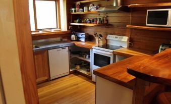 Enjoy dining on the superb log slab dining table and the fully set up kitchen has fridge/freezer, stove, microwave and small appliances.