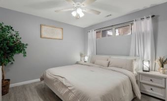 Furnished Guest room offers nightstands, with touch lamps, dresser, King-size bed, closet, large flat screen smart TV.