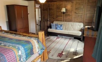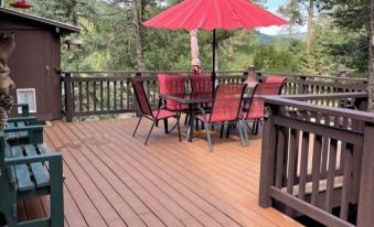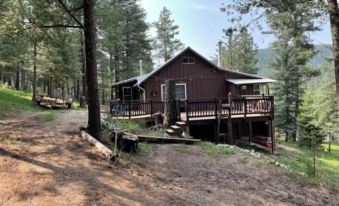 On the main floor is a large family room with a comfy sectional and plenty of extra seating, fireplace, dining area, cute, well stocked kitchen and a large master bedroom with a rustic, hand crafted, king size log bed. Upstairs is a loft with a full size bed which kids will love. Downstairs are three extra full size beds, and a half bath. An exterior door allows for easy access. Beautiful new deck with patio furniture and grill is perfect for experiencing the outdoors while you dine. The national forest is right outside the front door and allows instant hours of hiking. Wildlife abounds in this area and is often seen right out the kitchen or bedroom windows. Our cabin includes wireless wifi, two roku tvs, lots of board games, puzzles and books. Please note .. as with most cabins in these areas, there are steep stairs to the loft and also to the downstairs bunk room, which is where the extra beds are. Just fyi- in case youre unable to handle stairs. Also FYI..We have outdoor security cameras for our use to keep an eye on our property.About pets:No pets allowed.About checkOut:Check out before 11:00 AM.About children:Children allowed: ages 0-17.About customRules:NO HUNTING/SHOOTING on this property!!