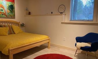 The downstairs is a walkout at lake level, featuring a very spacious living/family room with a colorful and comfortable sitting area (original Chicklet chairs from the 1970s) and plenty of space for playing. Here, you can again enjoy viewing the lake and socializing. The bedroom on this level has a queen bed and large closet. The full bath with shower is modern and a generous size. The lower level is perfect for a family as well, and we have at your disposal additional queen or twin air mattress for extra sleeping arrangements.