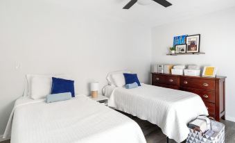 BEDROOM 1 (Primary) - King bed, Dresser, Ceiling fan, Large mirrored closet w/hangers • Luggage rack, Dual sink, Glass door oversized shower, Sitting area, Desk