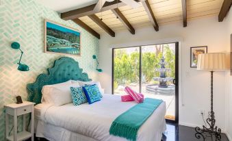 Also situated in the main house, this peaceful green-themed room, features a queen sized bed with a glamorous velvet headboard and luxuriously soft mattress, Brooklinen linens wall-mounted TV and ample closet space, plus its own modern bathroom with traditional Spanish style tiles.