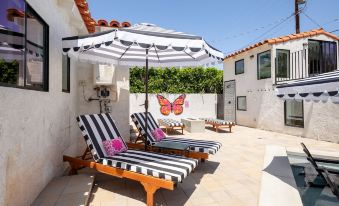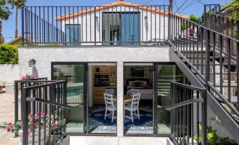 This upper level casita grants you a large deck overlooking the pool area, plus its own kitchenette, comfortable queen sized bed with luxuriously soft mattress and Brooklinen linens, wall-mounted TV and its own modern bathroom with shower.