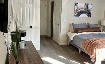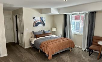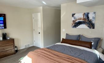 The studio features a thoughtfully curated interior, boasting a welcoming ambiance and tasteful decor. The main living space is furnished with a comfortable queen bed, providing a peaceful haven for a restful night's sleep after a day of exploring Park City's vibrant atmosphere. The room is bathed in natural light, creating a warm and inviting atmosphere.