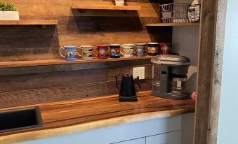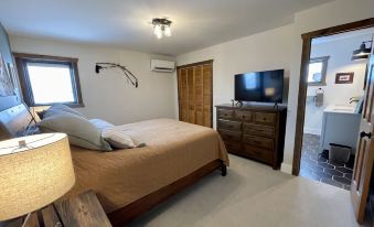 Up the colonial wooden staircase is a small landing which leads to one queen and one king, master bedroom, each with a 43” smart TV. The southern facing master has large picture window views of the Yellowstone River and a wooden desk for those working remotely with a printer to boot. Both bedrooms share a beautiful jack and jill bathroom with a glass shower, reclaimed wooden walls, a double sink vanity complete with a heated tile floor.