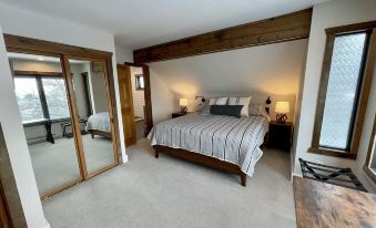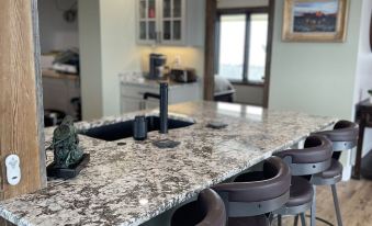 Just inside the front door is an entry way with a wooden console table, river rock coat hangers and large bench for easy removal and storage of outdoor gear. The main level boasts one bedroom, a full bathroom, laundry room with a new stack washer and dryer, kitchen, living and dining area. The bedroom has a queen bed and a 43” smart TV. The kitchen has all new stainless-steel appliances, granite counter tops, a wet island with an undermount sink and granite overhang with four bar stools plus a bonus pantry area with a coffee bar. Beyond the spacious kitchen is a full bathroom with a double glass shower, stylish double vanity with sit on top custom-made ceramic sink bowls and a heated tile floor.