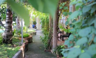 Location: Located near the main road, accessible via a well-lit alley, with many restaurants and shops nearby. The property has a beautiful pool surrounded by flowers and plants.