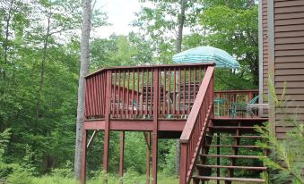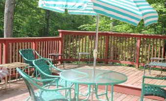Oak Leaf Lodge is a house with 2 comfortable upstairs rooms with queen beds and a large basement 'bunk room' with 4 twin beds. The main level features an open layout dining and living area with gas fireplace, kitchen, bath and a cozy reading area. There is a large deck overlooking the forest and another outdoor lounge area with chairs and a hammock off of the basement room. Oak Leaf Lodge is available year-round. The fully equipped kitchen includes a microwave, coffeemaker and tableware. There is an outdoor charcoal grill. Bed linens, kitchen and bath towels, and biodegradable soap are provided.