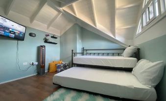 3 bedrooms: 2 single beds 1 queen bed 1 king bed and 2 double beds