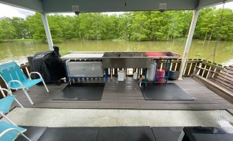 Houseboat located on a private road in Cypress Cove Marina. Drive up to private parking for 6 vehicles and walk just steps to the front door to unload your bags and tackle. The living area has plenty of room to hang out and talk about your catch with Sat TV, internet and cell booster. The kitchen has a full refrigerator, microwave, gas oven/range, coffee pot and everything you need to cook your fresh catch. We have 2 bedrooms, one with a twin bunk and the other with two sets of twin/twin bunks. The bathroom has a full shower. The covered back deck has a 3 compartment stainless sink, cleaning station, grill, fan, porch swing and extra seating. We have plenty of boat parking along the side and back porch of the houseboat as well.