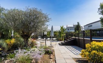 The property is modern, clean, and quiet villa style property with a beautiful garden and pool, and offers: 1) a credit card operating vending machine with beverages and snacks, 2) a private transport from and to the airport for a fee, 3) a small refrigerator in the room and a free daily coffee served by a pleasant and welcoming personnel, and 4) a free parking for your or rented car; and allows convenient food and groceries deliveries through a Glovo App.