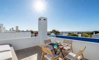 From the 50 sqm roof terrace of Casa Azul, where there is a lounge area for two as well as a charcoal grill with dining area, you have a fantastic view of the Atlantic Ocean. In this holiday home, which is located in Porches, two kilometres from Armacao de Pera in a very quiet complex, you can enjoy the sun on three levels. Two sunbeds and a dining table await you in the garden.