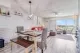 The kitchen includes a bar with two bar stools for additional dining. A contemporary