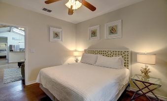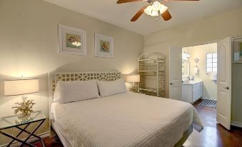 The master bedroom has a King size bed with ensuite bath. The guest bedroom has a queen size bed with twin bunks beds with a private entrance to the second full bath. The kitchen has everything you need to cook breakfast, lunch, and dinner, and your catch of the day! The cottage offers 3 smart TV's and 1 DVD player in the living area along with wireless internet. Enjoy a cup of coffee or glass of wine on the private breezeway. There is parking for two cars and a boat.