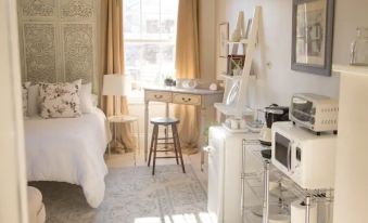 -There is not a full kitchen in this studio apartment. I have instead assembled a small kitchenette area. (See photos.) There you will have a microwave, toaster oven, Keurig coffee maker, tea kettle, small fridge, and water dispenser. The kitchenette area has been stocked with glasses, coffee cups, plates, bowls & cutlery, etc. Coffee, tea, and honey will be provided.
