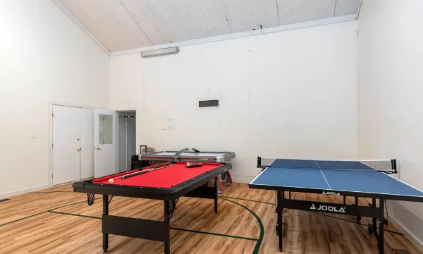 -1/2 indoor basetball court with pickleball net, basketball hoop, pool table, air hockey, and ping pong table