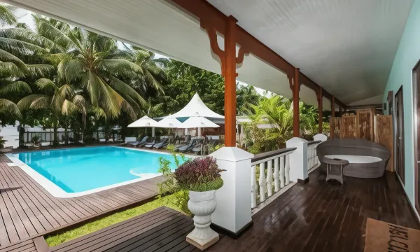 Location: Direct beach access with serene, uncrowded surroundings; proximity to airports, Vallée de Mai, and nearby shops/restaurants.