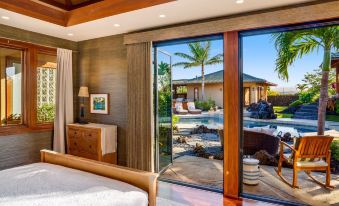 The heart of Hale Mele is its open-concept great room, seamlessly extending to a private outdoor oasis. At its center is a heated 84°F saltwater pool, hot tub, and serene cascading water features framed by lush, tropical landscaping. An outdoor pavilion offers shaded seating, a bar area, a barbecue grill, and a guest bathroom — the perfect setting for sunset cocktails and al fresco dining with panoramic views of Mauna Kea volcano.