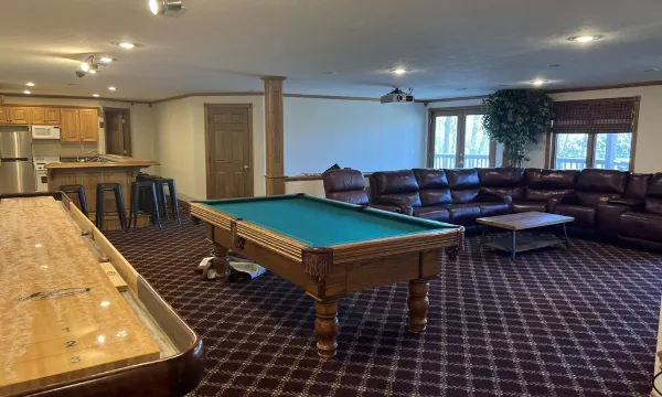 The house has a full basement of gaming fun for all ages to enjoy (pool table, air hockey, and shuffleboard). Comfortably sleeps up to 26 guests, with KING beds in 7 of 8 bedrooms. Just across the driveway is our shared swimming pool, arcade area, and a tennis court. When you get off the lake, relax in the Hot Tub overlooking the lake. About pets:No pets allowed.About checkOut:Check out before 10:00 AM.About children:Children allowed: ages 0-17.About checkIn:Check in after 4:00 PM.About smoking:Smoking is not permitted.About minBookingAge:Minimum age to rent: 21.About events:Events allowed: family gatherings, birthday parties, weddings.Maximum event attendees: 26.
