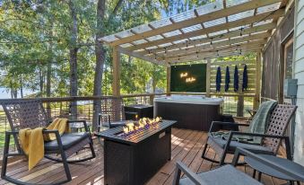 The grounds are expansive and there's so many activities for the whole family to enjoy - including a new massive fenced-in backyard (kids/dogs) for peak privacy and security! Towards the lake, there's a large wood-burning firepit area with 2 hanging swings, 4 Adirondack chairs, wood rack and cover, and killer lakefront views. Spread-out across the massive lawn with yard games (Cornhole, Kan Jam, Spikeball, Yard Jenga, volleyball set, and football) or use our multiple hammocks for snoozing. If the water is calling your name, the rare sandy beach is just steps away and great for easy lake access (for the kiddos, pups, and kayak/stand-up paddleboard launching), or go wet a line down at the dock - we even have some extra fishing poles! At the dock, you'll find plenty of seating, 4-person café set + large umbrella & stand, AM/FM + bluetooth radio, pool noodles, life jackets, and numerous other amenities! And if that wasn't enough, we include 2 kayaks and 2 stand-up paddleboards onsite too! Back at the main cabin, there's a screened-in side porch for lazy afternoon loungin' & sippin' and an open back deck with the gas firepit, 6-burner gas grill, rockers, and a full outdoor dining set with umbrella & stand - and don’t forget about the hot tub to really get relaxed with amazing lake views! Finally, if you really want outdoor living at its finest, head-out to The Perch (cookhouse/open-air lounge) to fire-up the wood-fired grill (or fireplace) while having a night-cap and watching your favorite show/movie/sports with friends and family - there are even heaters and fans in this space - ENJOY!