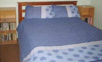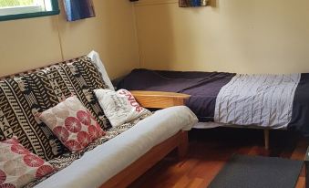 Clean, tidy and cosy, sleeps 5. Queen bed in bedroom, double sofabed and single divan in lounge. Duvets and pillows provided. The bathroom is in an adjacent wash-house. The kitchenette has double hotplates, a microwave, fridge, and Zip water heater, along with crockery, cutlery and cooking gear.