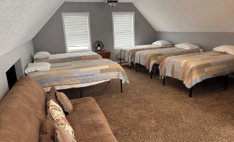 3 bedrooms downstairs with large loft area upstairs with 5 twin beds. Roku TV upstairs and down. Video game hook ups on both TV's. Free Wi-Fi. One full bath on main floor. Two additional showers and 2 toilets downstairs, with outside entrance. Coin operated washer/dryer downstairs. All bed and bath linens provided. Outside patio with patio furniture and gas grill provided.