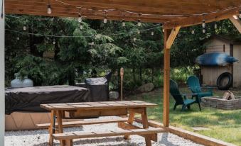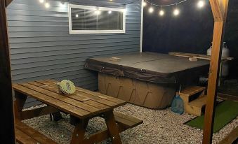 The backyard offers plenty of seating for two, as well as a picnic table, which has a built in cooler in the center to keep your choice of refreshments. Feel free to grill on the Traeger wood pellet grill! You can also relax and enjoy the hot tub at your leisure!