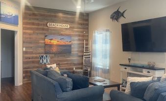 The living area has a 75 inch Roku tv and sofas soft and comfy enough for an afternoon nap or a family movie night.