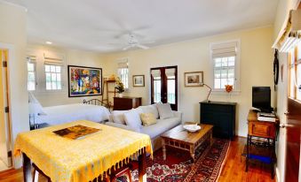 The cottage has a private balcony and shares a courtyard with gas grill with the main house. It includes a queen size bed and sleeper sofa. The kitchen is fully equipped and includes 1/2 size frig, stove, oven, microwave, dining table and 4 chairs. Television, CD player, and wireless internet provided. Bath includes tub with shower. Stackable washer/dryer is in the garage along with beach chairs, beach toys, and bikes that may be used. About pets:No pets allowed.About checkOut:Check out before 11:00 AM.About children:Children allowed: ages 0-17.About checkIn:Check in after 4:00 PM.About smoking:Smoking is not permitted.About minBookingAge:Minimum age to rent: 25.About events:No events allowed.