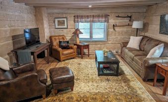 Enjoy staying in an early 1800s log cabin with modern amenities. The Red Roof Cabin has a wrap around porch overlooking the stream, a full kitchen and bath, one large bedroom upstairs and wooded trails just steps away.
